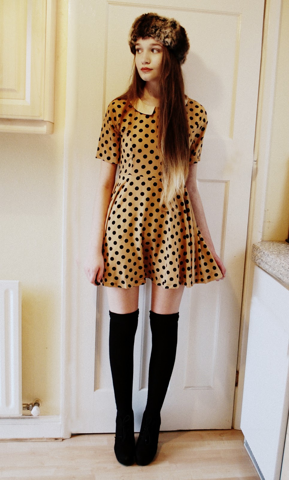 That Market HQ dress you're wearing is super cute. I love the unusual color of it as well as the polka dots and the funky collar. Paired with those knee highs, your dress definitely gives off the cutest schoolgirl vibe! Your new furry headband is also pretty fabulous. It seems like it would definitely keep your ears toasty warm in the winter. Not to mention the fact that it's so cute and matches really nicely with the color of your dress!