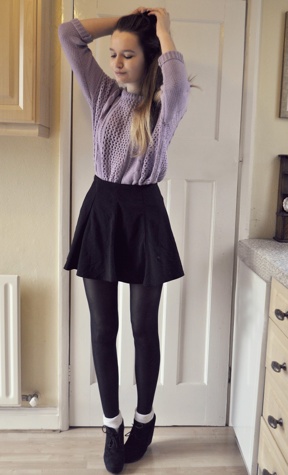 Hola ;) I managed to take some outfit photos yesterday before anticipating to leave the house... until I stepped outside and realised it was not weather appropriate. This outfit reminds me of what I wear to school on a daily basis with a shirt underneath the jumper, we are forced to wear 'suits' so this skirt is my solution for this :) It's also a really nice shape I think and is perfect for tucking in my jumpers which are always a bit too big for me. My parents have been away in Morocco for the past week so I have had to fend for myself.. involving taking public transport to school (the horror of waking up at 6:30 still haunts me) and actually having to cook myself food. Haha anyway they returned today and I have survived! Yesterday was my best friend Ann-Marie's birthday so we had a little celebration thing in the evening so that was cute too. Anyway here is my outfit and excuse the second photo,thought it was quite amusing, happily adjusting my hair ;) xx